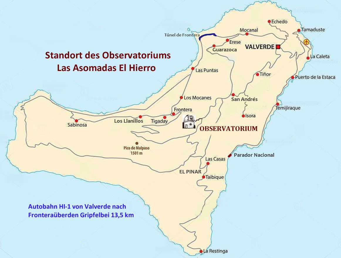 Das Observatorium befindet sich oben auf dem Berg auf der Insel El Hierro, am nordwestlichen Rand des Steilhangs von El Golfo, auf 1354 m Höhe über dem Meeresspiegel.