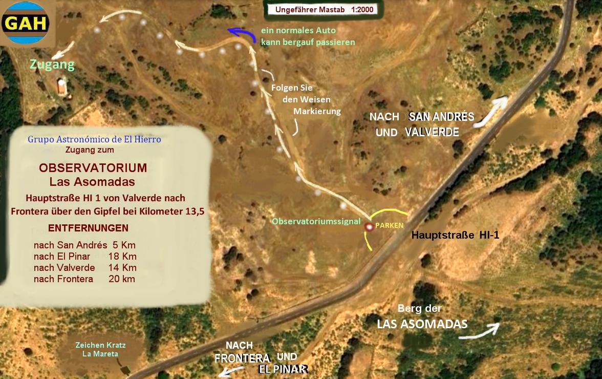 Um dorthin zu gelangen, nimmt man die Straße von Valverde nach Frontera über den Berg (nicht durch den Tunnel). Beim Kilometer 13,5 zweigt ein Pfad ab – ohne direkte Beschilderung an der Straße, aber etwa 20 m weiter gibt es ein Schild mit der Aufschrift „OBSERVATORIO“. Wenn du von Valverde kommst: rechts abbiegen Wenn du von Frontera kommst: links abbiegen