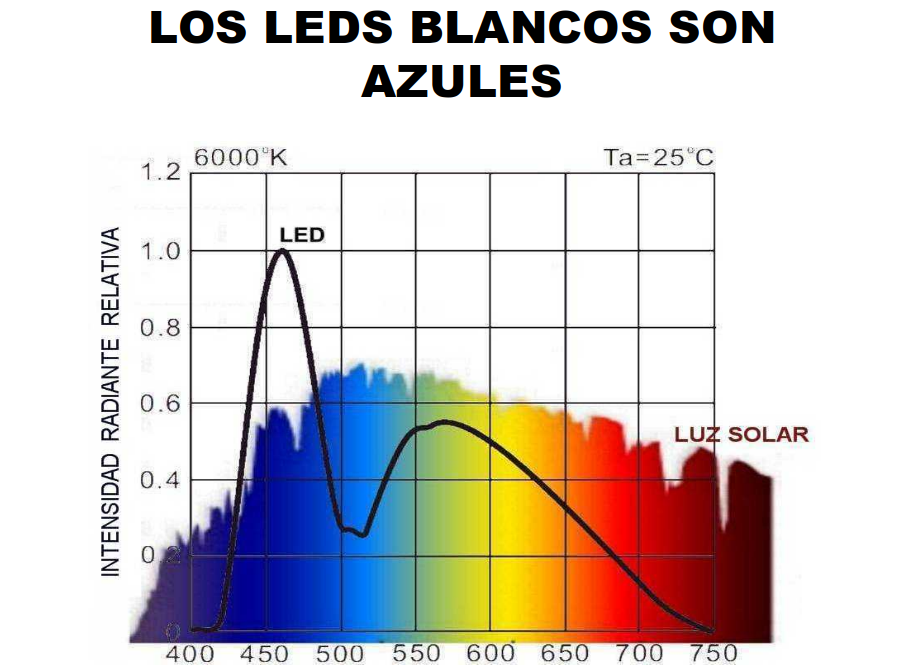 Y aquí es donde llega la sorpresa. Los diodos emisores de luz -LED- emiten naturalmente en azul; vemos en la imagen un espectro de las emisiones de un led blanco de alta eficacia. La punta más alta de emisión corresponde a unos 460 nanómetros, es decir, al color azul. Entonces ¿porqué los vemos blancos? Sabemos que la luz del Sol es una mezcla de colores, pues bien, la forma de hacer pasar el azul del LED por blanco es introducir ciertas sustancias en el interior de la lámpara que se caracterizan porque cuando reciben radiación azul la reemiten en otros colores -principalmente como se ve en la imagen verde amarillento-, dando como resultado una mezcla que tiende al blanco azulado. Esto se hace para intentar asimilar el espectro del LED al del Sol que vemos en la imagen en segundo plano.