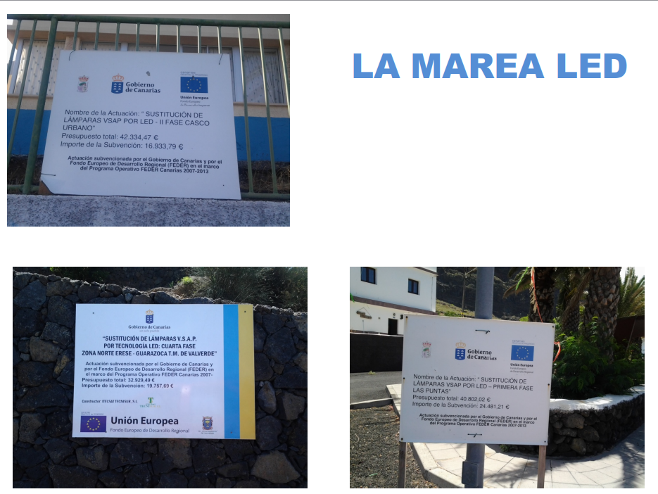 ¿Porqué este cambio? De un lado la clase política se encuentra, como vimos en los carteles anteriores, con generosas cofinanciaciones procedentes ni más ni menos que de la Unión Europea, via el ministerio correspondiente que las avala como un ejemplo de progreso y ahorro energético. Por otro lado, los técnicos encargados de la realización del cambio eligen de un catálogo de fabricantes que siempre presenta los LED blancos de alta eficacia como la solución más adecuada al problema de la iluminación pública.