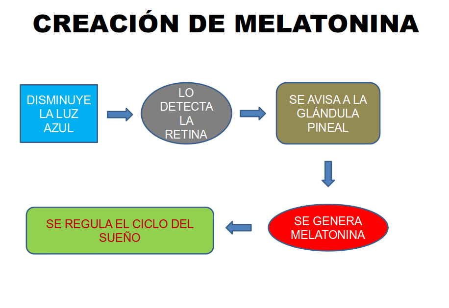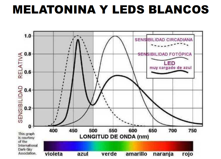 Por lo tanto si la glándula pineal recibe un aviso de color azul -aunque sea de noche- entenderá que es de día y, por tanto, dejará de producir melatonina para que los órganos se reactiven. Esto se traduce en dificultades para dormir de noche. Y hay que recordar que los LED aparentemente blancos, en realidad, son azules. En consecuencia los LED blancos de alta eficacia en la iluminación pública pueden tener influencia en la falta de sueño de las personas más sensibles si sus viviendas están situadas en una zona con iluminación de este tipo.