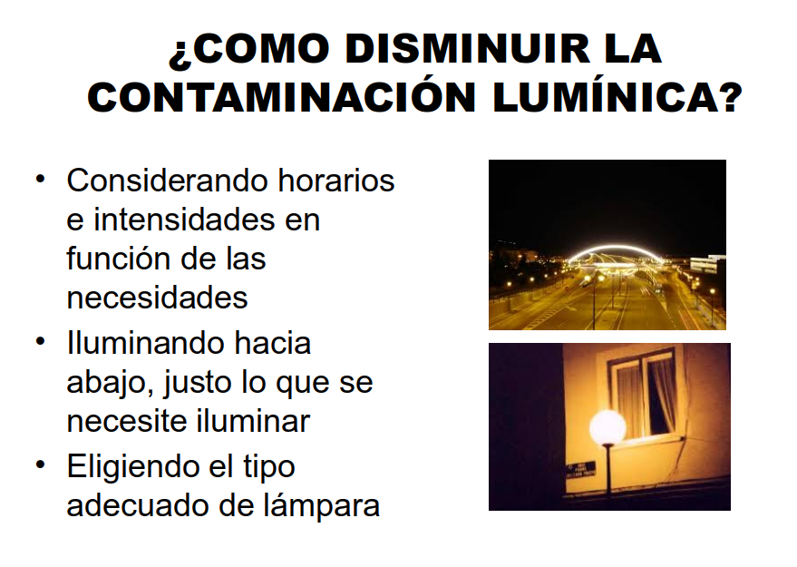 Suponiendo que las autoridades competentes tomaran conciencia del problema y estuvieran dispuestas a cambiar algo para resolverlo, la solución pasaría por tres acciones: variar la iluminación dependiendo de la hora, dirigir las luminarias exactamente hacia abajo y elegir el tipo de lámpara más adecuado a cada función.