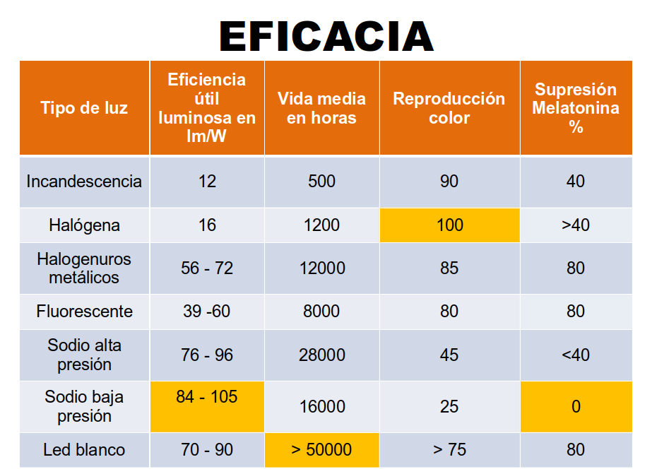 Como puede apreciarse en esta tabla las eficacias de las lámparas de sodio no están muy alejadas de las de los LED por lo que la justificación de eficacia para el cambio no es muy contundente. Hasta la generalización de los LED naranjas para la iluminación pública se deberían conservar las redes actuales, si su eficacia es comparable.