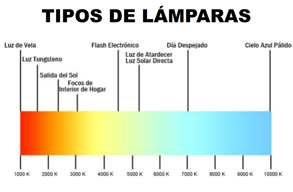 Pero también hay que tener en cuenta el tipo de lámpara. Desde luego no da igual una que otra. La luz del Sol es una mezcla de colores (longitudes de onda en Física)y la preponderancia de uno u otro en cada tipo de lámpara depende de su naturaleza y composición. Hay una escala en grados Kelvin (escala distinta a la que estamos acostumbrados cuya diferencia para nuestra exposición no tiene importancia) que establece una relación entre la temperatura y el color por lo que se ha venido en llamar algo confusamente temperatura de color.