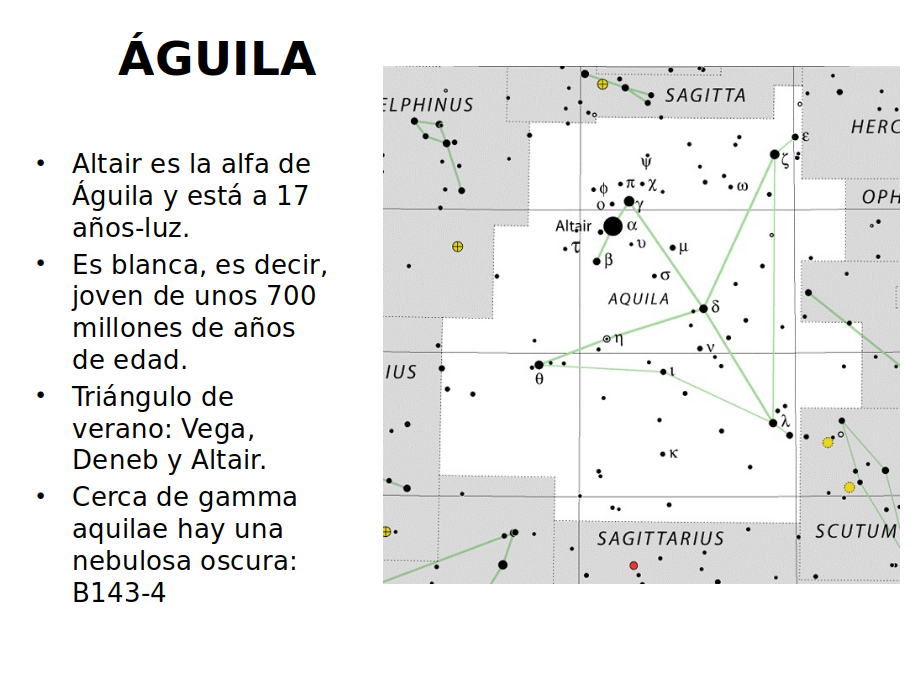 Águila es la tercera constelación que, con Lira y Cisne, forman un triángulo en el cielo bien conocido por los aficionados. Ese triángulo tiene por vértices Vega (alfa de Lira), Deneb (alfa del Cisne) y Altair (alfa del Águila). El brillo de las estrellas de cada constelación define el nombre clásico de cada estrella siendo la más brillante alfa, la siguiente beta ,etc. Cerca de la estrella Gamma Aquilae hay un objeto interesante.
