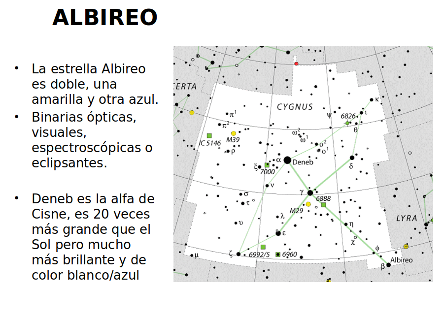 Otra de las constelaciones brillantes del verano es la del Cisne. La cabeza del cisne es Albireo, una estrella doble ciertamente espectacular si se observa con un telescopio, por el contraste entre sus dos estrellas: una amarilla y otra azul. Esto nos da pie para detenernos un instante para hablar de las estrellas dobles.