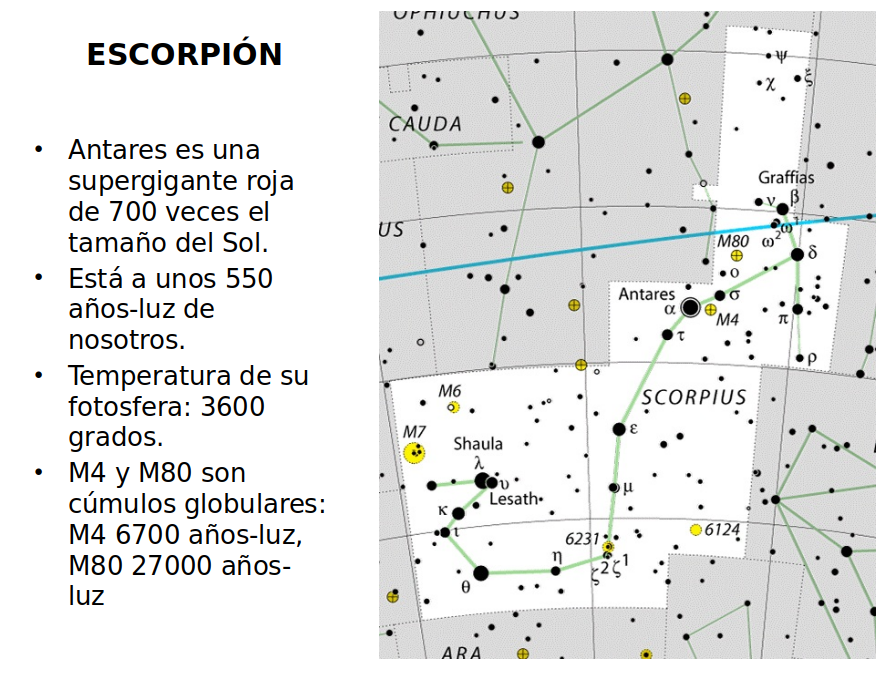 Escorpión es una constelación visible junto a la Via Láctera de un tamaño considerable. El nombre de su estrella principal -Antares- indica que su brillo rojizo y fuerte podría ser confundido con el del planeta Marte por lo que se denominó anti-Ares (Ares es el nombre de Marte en griego) y, abreviando, Antares.