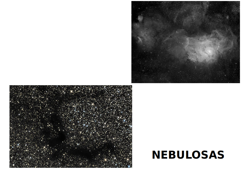 Lo que hace a este objeto interesante es que no se ve. En la imagen iferior izquierda podemos ver una fotografia de una sombra oscura recortada sobre el fondo de estrellas. Se trata de una nebulosa oscura, la B143-4, que ocupa una porción de espacio no dejando que veamos lo que hay detrás. Hay otras nebulosas brillantes como la M8 en Escorpio que podemos ver en el cuadro superior derecho; estas otras brillan al reemitir la radiación que reciben de alguna estrella cercana. Como ya vimos, unas y otras son origen y fin de las estrellas.