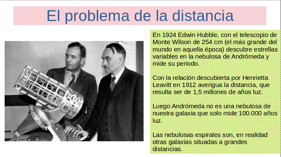 En 1924 Edwin Hubble resuelve de manera inequívoca la polémica al demostrar, observando las cefeidas de la galaxia de Andrómeda, que las nebulosas estaban fuera de nuestra galaxia y, en realidad, eran otras galaxias.