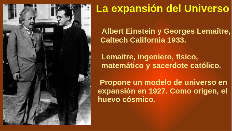Ya en 1927, Georges Lemaître dedujo de las ecuaciones de la teoría de la Relatividad de Einstein, que el Universo tendría que estar expansionándose. Aunque Einstein no estuvo de acuerdo con esta interpretación de su teoría, finalmente en 1933 reconoció su error y dio la razón a Lemaître
