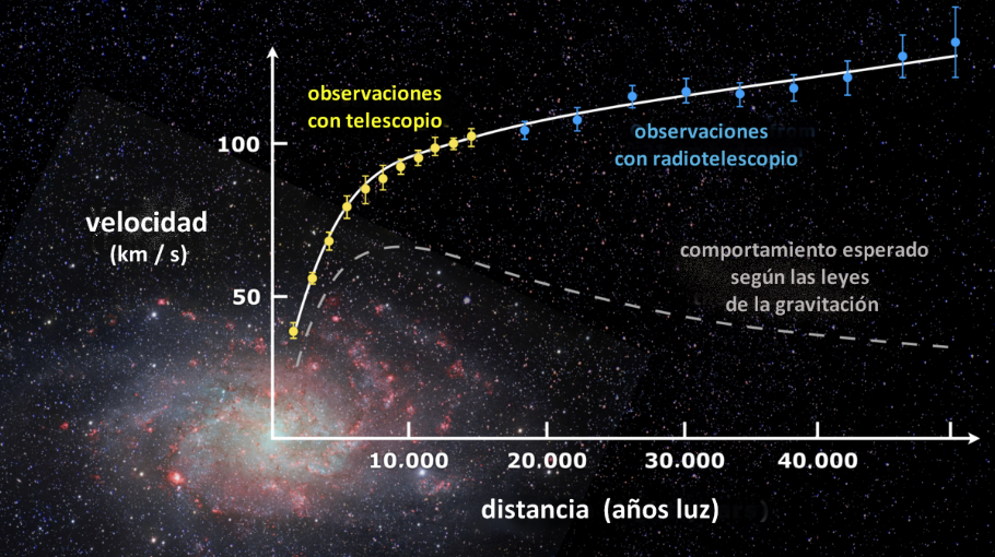 Uniendo las medidas de los telescopios ópticos en nuestro lado de la galaxia y de los radiotelescopios en el otro lado, se ha llegado a la conclusión de que las velocidades de las estrellas en el borde exterior son superiores a las que corresponderían por las leyes de la mecánica clásica, como ya adelantó la señora Rubin en 1968.